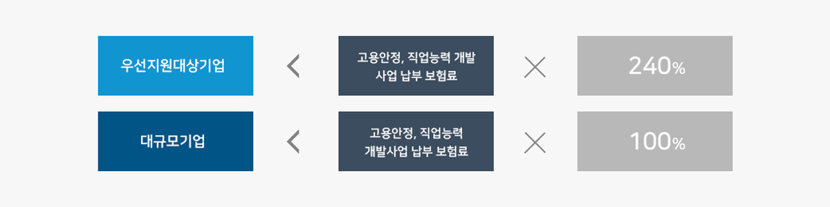 사업주가 ‘보험료 징수법’에 따라 부담하는 해당 연도 고용안정ㆍ직업능력개발사업 보험료의 100% (우선지원대상기업은 240% 지원)