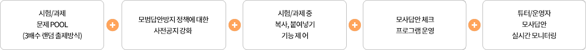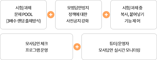 모사답안 방지시스템은 홈페이지 게시, 전체공지, 강의실 공지, 시험전 유의사항 공지와 3배수 문제은행에서 랜덤 출제 시스템, 마우스 복사기능 금지로 구성된 사전예방단계와 1차 모사체크 프로그램 실행 후 2차 튜터/운영자 확인의 단계를 거치는 프로세스로 운영됩니다.